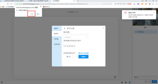 1.观看直播需要浏览器安装Flash插件,建议使用360浏览器,进入直播间后会弹出《使用您的摄像头》、《使用您的麦克风》需要点击“允许”;如果使用苹果手机,需从相应公众号“云端课堂”进入或在微信中打开网校地址(https://eschool.zhixiangxue.com/)观看直播。