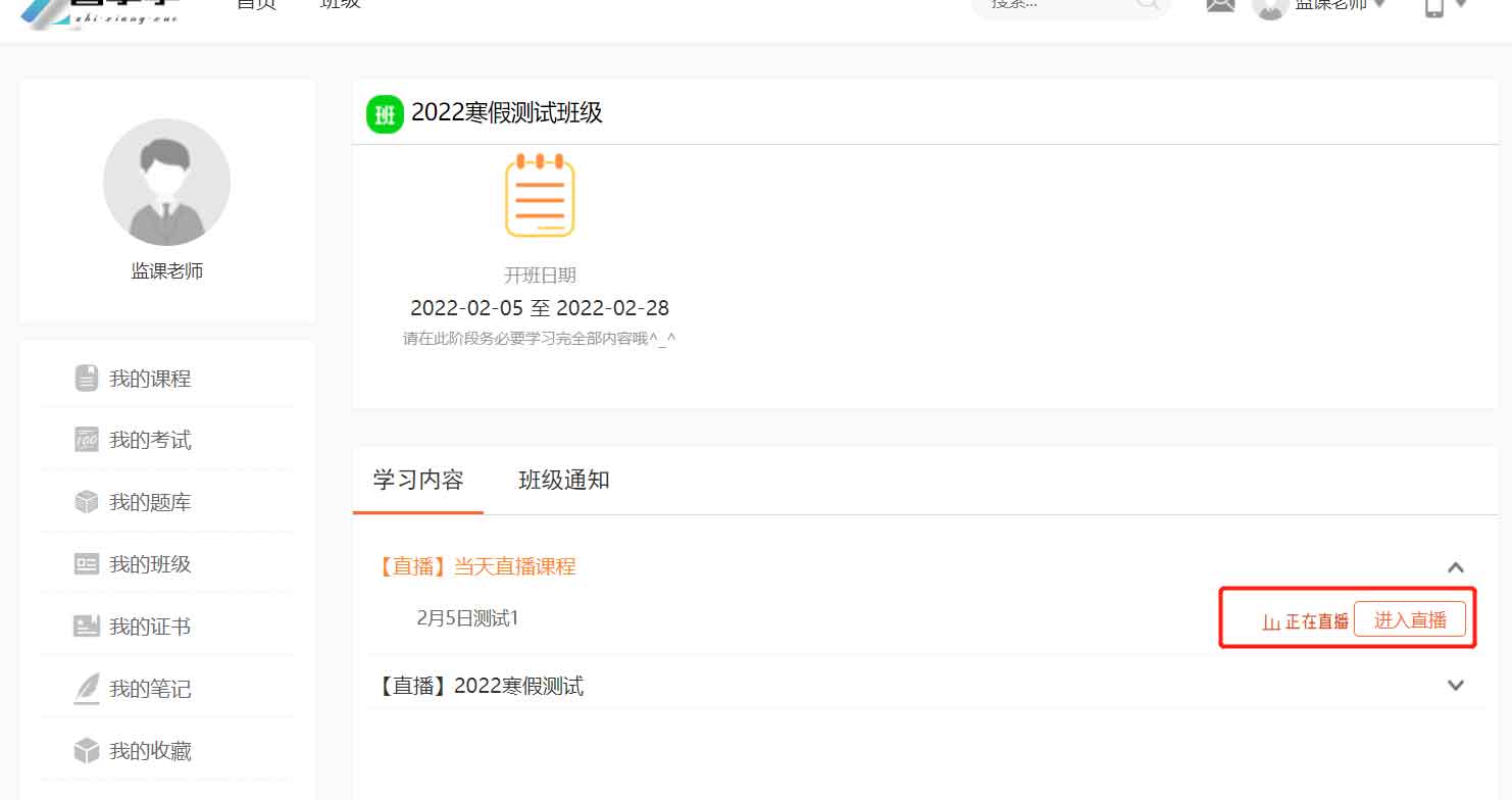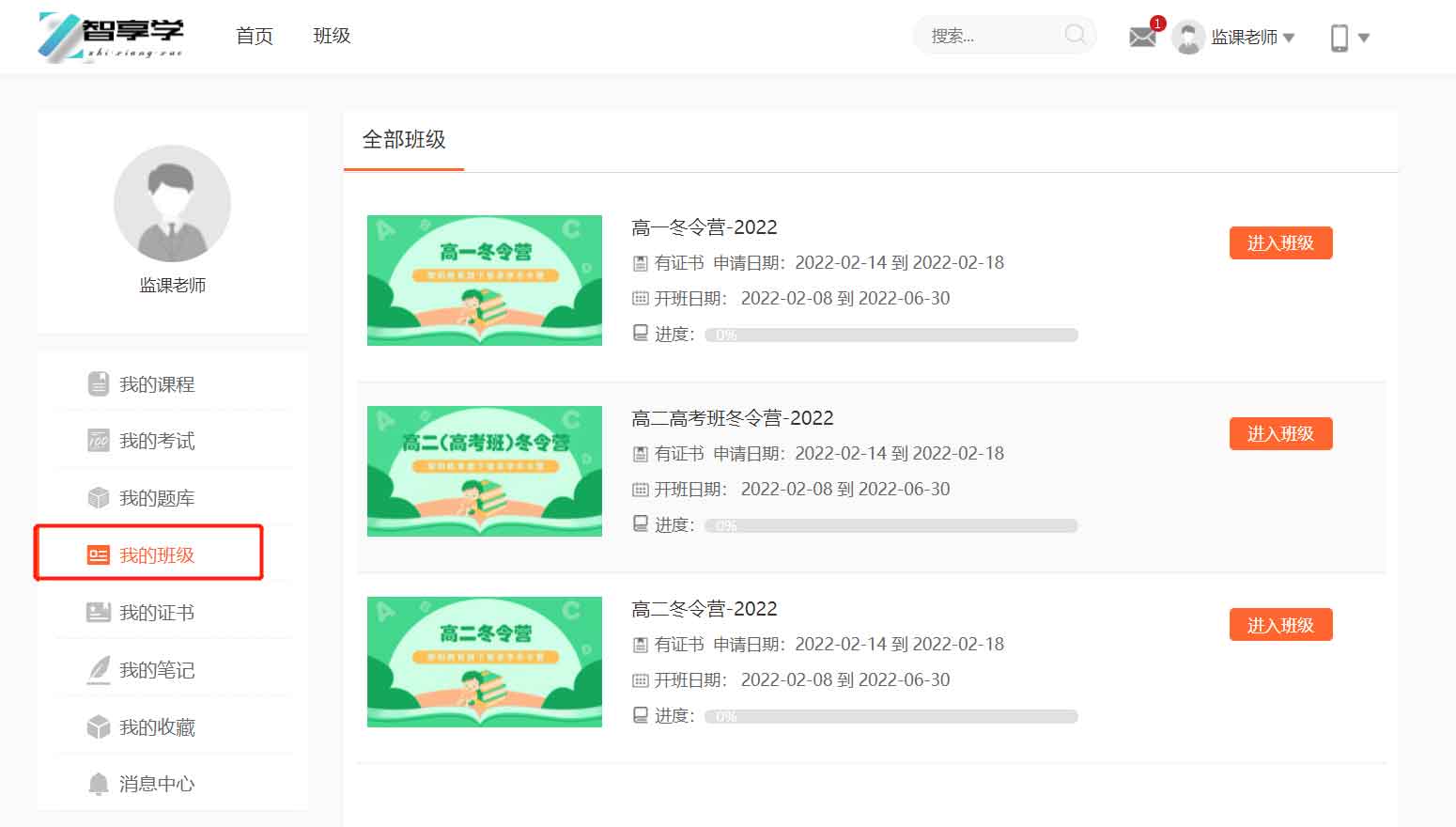 2.点击左边我的班级菜单,显示当前账号所加入班级,例如“高一冬令营-2022”,然后点击进入班级。